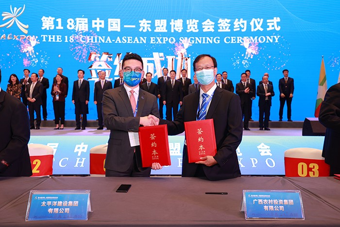 在9月10日下午舉行的第18屆中國—東盟博覽會簽約儀式上,太平洋建設(shè)與廣西農(nóng)村投資集團(tuán)簽署戰(zhàn)略合作協(xié)議。
